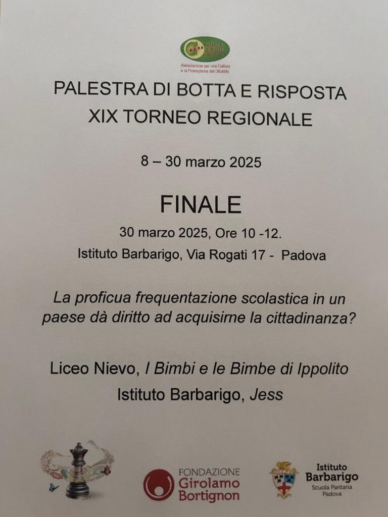 La finalissima, incentrata sul tema “La proficua frequentazione scolastica in un paese dà diritto ad acquisirne la cittadinanza?”, ha visto prevalere la squadra Jess dell’Istituto Barbarigo, con onere contro, su I Bimbi e le Bimbe di Ippolito del Liceo Nievo, con onere pro. Una vittoria che conferma il Barbarigo come polo di riferimento per la formazione al dibattito regolamentato e per la valorizzazione della teoria e pratica dell’argomentazione.